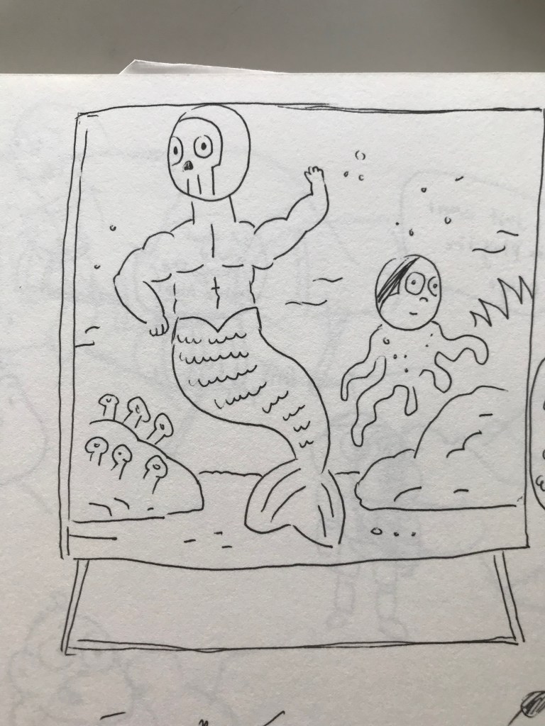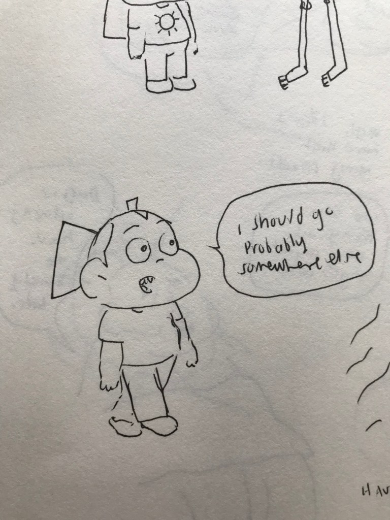 - Start sketching characters and backgrounds but only like stick figures and loose forms (that no one understands). This approach allows me to be very fast without entering into details. I seek for a good composition, leaving space for speech bubbles or anything else needed.