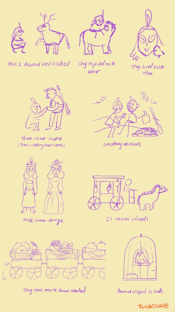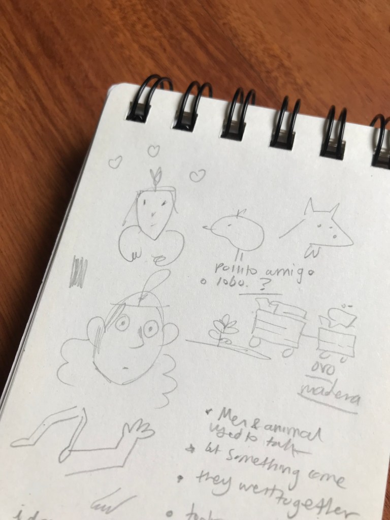 Because this story has text, I quickly write a first draft of the sentences. Quick is the main point for me at this moment, slowly fine tuning will come later. However, having the text allows me to understand how many drawings I will need and if the story has potential and can live for itself.